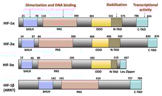 Structurally, all three HIF-α and the HIF-1β subunits contain a basic helix-loop-helix (bHLH) and a twin Per-ARNT-Sim (PAS) domain in the N-terminal part of the protein. These domains are responsible for heterodimerization between the α and β subunits (Figure 1) [].