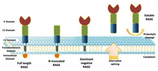 The full-length form of RAGE consists of three main regions: an extracellular part (amino acids 23–342) itself divided into a variable-like (V) and two constant-like (C1 and C2) immunoglobulin (Ig) domains, a transmembrane domain (amino acids 343–363), and a cytoplasmic domain (amino acids 364–404) (Figure 2) []. Two other isoforms of RAGE are the N-truncated RAGE (amino acids 124–404), where the N-terminal V-like domain is deleted [], and the dominant negative isoform (amino acids 23–363), where the cytoplasmic domain is missing. In addition, two different types of soluble isoforms of RAGE (sRAGE) (amino acids 23–342) have been described []. sRAGE contains the extracellular part but lacks the transmembrane and cytoplasmic domains. sRAGE can be generated as a result of a splicing event or by proteolytic cleavage of full-length RAGE [].