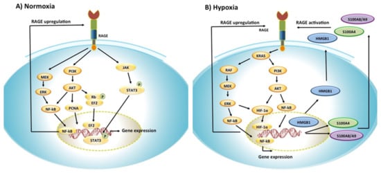 RAGE signaling pathways in normoxia and hypoxia. (A) In normoxia, RAGE activation by its ligands results in the activation of the MEK/ERK, PI3K/Akt, and JAK/STAT pathways, resulting in gene expression through the activation of NF-kB and STAT3. Because the expression of RAGE is under the control of NF-kB, RAGE activation results in RAGE upregulation through positive feedback. (B) In hypoxia, RAGE activation has been shown to stimulate HIF-1α through the activation of the PI3K/Akt and the RAS/RAF/MEK/ERK pathways. In hypoxia, nuclear HMGB1 translocates to the extracellular space through an unknown mechanism and interacts with RAGE. S100A4 and S100A8/A9 are upregulated and secreted in the tumor microenvironment and interact with RAGE. RAGE interaction with HMGB1, S100A4, and S100A8/A9 results in the activation of the MEK/ERK and PI3K/Akt pathways, resulting in changes in cancer-related gene expressions through the activation of NF-kB. NF-kB can further induce HIF-1a expression.
