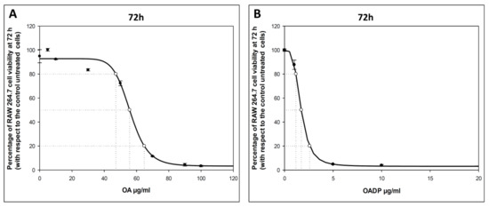 Effect of OA (A) and OADP (B) on cell proliferation of RAW 264.7 macrophage murine cells, after treatment with the compounds for 72 h. Each point represents the mean value ± S.D. of at least two independent experiments performed in triplicate.
