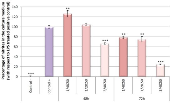Effect of OADP on NO production in RAW 264.7 macrophage murine cells, after treatment with OADP for 48 h and 72 h at the ½ IC50 and ¾ IC50 concentrations. Data represent the mean ± S.D. of at least two independent experiments performed in triplicate. Key: (**) p < 0.01 and (***) p < 0.001, with respect to LPS-treated control cells (positive control).