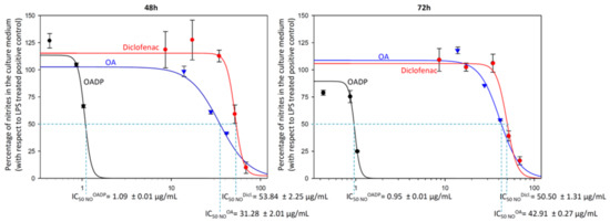 Sigmoidal curves of the effect of OADP (black), OA (blue) and diclofenac (red) on nitrite release in RAW 264.7 cells, after treatment with the compounds for 48 h and 72 h. Data represent the mean ± S.D. of at least two independent experiments performed in triplicate.