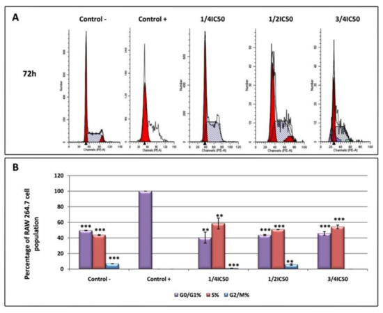 DNA histograms of cell cycle analysis of RAW 264.7 macrophage murine cell, after treatment with OADP for 72h at the ½ IC50 and ¾ IC50 concentrations (A). Percentage of RAW 264.7 macrophage murine cell population in the different phases of the cell cycle (G0/G1, S and G2/M) (B). Data represent the mean ± S.D. of at least two independent experiments performed in triplicate. Key: (**) p < 0.01 and (***) p < 0.001, with respect to LPS-treated control cells (positive control).