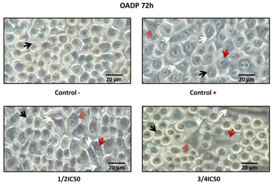 Morphological transformation in RAW 264.7 cells stimulated with LPS and OADP treatment for 72 h at the ½ IC50 and ¾ IC50 concentrations. The black arrows indicate Raw 264.7 cells in monocyte state. The red arrows indicate Raw 264.7 cells in macrophage state. The white arrows indicate cytoplasmic projections.