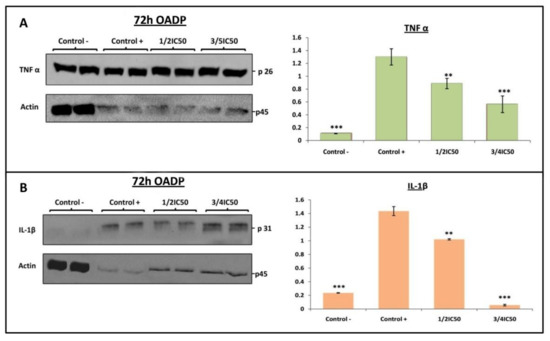 Western blot of the levels of TNF-α (A) (p26) and IL-1β (B) (p31) proteins on LPS-stimulated Raw 264.7 cells, after treatment with OADP for 72h at the ½ IC50 and ¾ IC50 concentrations. Protein expression levels are expressed as arbitrary intensity units for each band compared to arbitrary intensity units for actin (p45). Variations in the relative percentages of TNF-α and IL-1β expression for each concentration are also shown. The values represent means ± S.D. of at least two separate experiments. Key: (**) p < 0.01 and (***) p < 0.001, with respect to LPS-treated control cells (positive control).