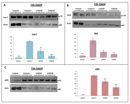 Western blot of the levels of proteins COX-2 (A) (p72), iNOS (B) (p130), and p-IκBα (p40) (C) on LPS-stimulated RAW 264.7 cells, after treatment with OADP for 72h at the ½ IC50 and ¾ IC50 concentrations. Protein expression levels are expressed as arbitrary intensity units for each band compared to arbitrary intensity units for actin (p45). Variations in the relative percentages of TNF-α and IL-1β expression for each concentration are also shown. The values represent means ± S.D. of at least two separate experiments. Key: (**) p < 0.01 and (***) p < 0.001, with respect to LPS-treated control cells (positive control).