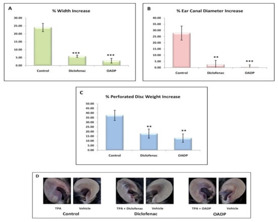 Increases in the percentage of the different morphological parameters: Width (A), diameter of the external auditory canal (B), and weight of the 6mm disc practiced (C). These increases have been calculated from the differences between the left and right ears in the different groups of mice (Control, Diclofenac, OADP) (D). The mean ± S.E.M. is shown for each of these parameters (n = 4).