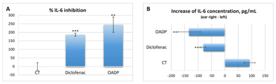 IL-6 inhibition percentage, calculated from the differences between the left and right ears in the different groups of mice (A). Increases in IL-6 concentration (pg/mL) calculated from the differences between the left and right ears in the different groups of mice (control, diclofenac and OADP) (B). The mean ± S.E.M. is shown for each of these parameters (n = 4). Key: (**) p < 0.01 and (***) p < 0.001, with respect to the control group of mice.