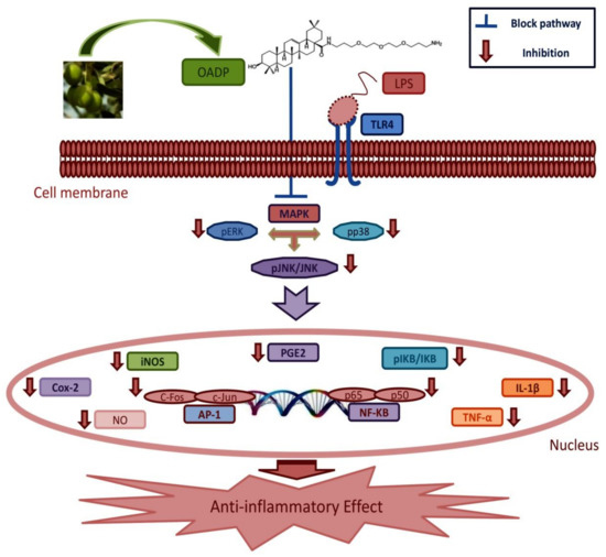 With the results found and considering the bibliographic data on the anti-inflammatory action of triterpene compounds, the following molecular mechanism was proposed for the anti-inflammatory action of OADP (Figure 11). OADP could inhibit the activation of the TLR4 or TNFR2 receptors, preventing the activation of MAP kinases (ERK, JNK or p38) or inhibiting the phosphorylation of IκBα, which would lead to the inhibition of the activation of pro-inflammatory transcriptors such as NF-κB or the AP1 set (c-Jun, c-Fos, JunB, or JunD). Finally, all this could produce the inhibition of the expression of pro-inflammatory cytokines such as TNFα, IL-1β or IL-6, and the proteins that are expressed in pro-inflammatory processes such as COX-2 or iNOS.