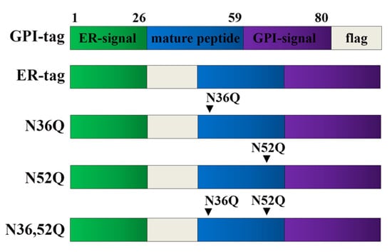 CD24 possesses two potential N-glycosylation sites, N36 and N52, among the 4 asparagine residues present in the 33 amino acid mature protein. The involvement of N-glycosylation in CD24 sorting was first investigated using single (N36Q, N52Q) and double (N36,52Q) point mutants of CD24 (as illustrated in Figure 4).