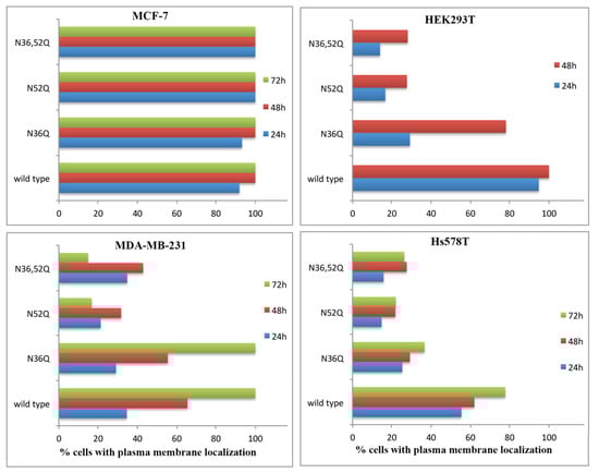 Asparagine-to-glutamine mutation at N52 showed a more dramatic effect on CD24 localization; MDA-MB-231, Hs578T and HEK293T cells showed a significant decrease of CD24 plasma membrane localization. A similar pattern in the three cell lines was observed by the double N36,52Q CD24 mutation, confirming the significance of the N52 glycosylation for the localization of the CD24 (as illustrated in Figure 4, Table S2). Plasma membrane localization was restored following incubation of N52Q transfected HEK293T cells with the proteasome inhibitor MG132 (as illustrated in Figure S4), suggesting a reduced stability at the plasma membrane of mutated N52Q compared to that of wild type CD24. MCF-7 cells did not show any phenotypic variation upon transfection with wild type, N36Q, N52Q, or N36,52Q CD24.