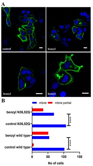 MCF-7 cells transfected with wild type, N36Q- or N52Q-CD24 did not show significant changes in the percentages of cells with plasma membrane or cytoplasmic localization, although an increase of cells expressing both cytoplasmic and peripheral wild type (p < 0.01) and N36Q-CD24 (p < 0.05) was observed following kifunensine treatment (as illustrated in Figure 5 and Figure S5A,B). In contrast, sorting and localization of CD24 at the plasma membrane was affected by kifunensine in all other studied cell lines.