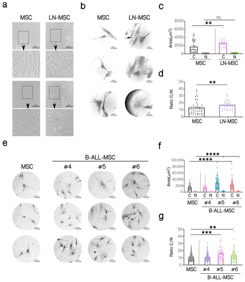 Morphological characterization of MSC co-cultivated with REH cells (LN-MSC) and MSC isolated from BM B-ALL patients (B-ALL-MSC). (a) Microphotographs of normal MSC and LN-MSC. Morphology was analyzed using phase contrast microscopy at 10× magnification. Scale bar, 100 µm. Bottom, a zoomed-in view from the boxed region above. (b,e) Microphotographs of a representative experiment are shown of MSC, LN-MSC, and B-ALL-MSC stained with Wright dye and acquired using an optical microscope at 100× magnification. Scale bar, 10 µm. (c,f) Determination of the cytoplasm (C) and nucleus (N) areas (µm2). (d,g) Evaluation of the cytoplasm to nucleus (C/N) ratio. Data are expressed as mean ± SEM. Each point on the graph represents a measurement. Two experiments with six replicates were analyzed. p-value ** < 0.01, *** < 0.001, **** < 0.0001 by the Kruskal–Wallis test with Dunn’s post-hoc analysis.