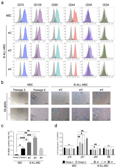 Phenotypic characterization of B-ALL-MSC and evaluation of senescence markers. (a) Immunophenotyping of B-ALL-MSC. Fluorescent histograms for the cell surface markers CD73, CD105, CD90, CD44, CD45, and CD34 on MSC from healthy patients and three B-ALL-MSC (#2, #3, #4). As controls, MSC from healthy patients in passages 4 (P4) were used. The grey histograms represent unlabeled cells, while color histograms correspond to the markers evaluated. The histograms shown are from a replicate. One experiment, three replicates. (b) SA-βGAL activity in B-ALL-MSC. As controls, MSC from healthy patients in passages 3 (P3) and 6 (P6) were used. Microphotographs at 10× (Scale bar, 100 µm) and 40× (Scale bar, 20 µm) magnification, of representative experiments are shown. (c) Quantification of the percentage (%) of cells positive for SA-βGAL in B-ALL-MSC. (d) Expression of p16, p21, p53, and RB mRNA in B-ALL-MSC. Expression of mRNA calculated from the Ct of the target gene relative to the housekeeping gene GAPDH (1/(Ct Target gene—Ct GAPDH)). Data are expressed as mean ± SEM. Four experiments with 12 replicates were analyzed. p-value * < 0.05, ** < 0.01, *** < 0.001, **** < 0.0001, ns (not significant) by Brown-Forsythe and Welch ANOVA test with Dunnett’s T3 post-hoc analysis.