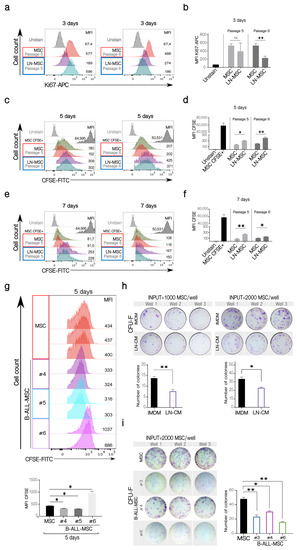 To further explore the characteristics of this senescence process, MSC proliferation was evaluated. A decrease in the expression of Ki67 in the LN-MSC (Figure 3a,b, left panels) was found, and this difference was statistically significant when MSC from passage 6 were used (Figure 3a,b, right panels). To evaluate this for a longer period of time, MSC were labeled with CFSE, and the preservation of the fluorescence, indicative of less proliferating cells, was evaluated 5 and 7 days after the co-culture. As expected, lower cell proliferation was observed in LN-MSC after 5 (Figure 3c,d) and 7 days (Figure 3e,f). Similar results were obtained in MSC from passages 5 and 6 (Figure 3c–f). On the other hand, B-ALL-MSC showed variable proliferation capacity with one MSC sample showing lower and two higher cell proliferation than control cells (Figure 3g). Finally, the CFU-F assay showed less capacity to form fibroblastoid colonies in LN-MSC (Figure 3h); in this case, in order to avoid interference of the few REH cells remaining in the culture, we used a conditioned medium obtained from a co-culture of MSC and REH cells (LN-CM). Of relevance, the three B-ALL-MSC samples showed less capacity to form CFU-F (Figure 3i), despite the fact that two of the samples had previously shown slightly increased cell proliferation. Together, these experiments showed that recently isolated MSC from B-ALL patients present similar alterations in terms of morphology, cell surface markers, colony formation capacities, and, importantly, induction of a senescent process, as happens in LN-MSC.