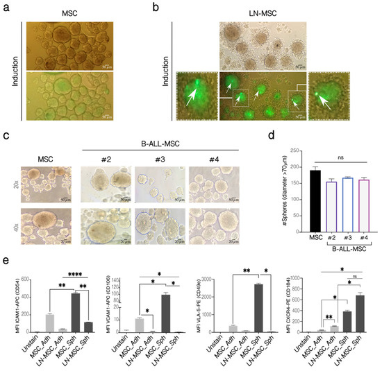 Mesensphere-forming assay of LN-MSC and B-ALL-MSC. (a) MSC in monoculture and (b) LN-MSC cultured for 5 days with sphere-inducing factors. REH cells were labeled with CFSE at the beginning of the co-cultures. Autofluorescence of MSC was observed in the FITC channel. Microphotographs at 20× under phase contrast microscopy and fluorescence microscopy of one experiment are shown. Scale bar, 50 µm. Zoomed-in views of two cells are shown on the left and right photographs with arrows indicating REH fluorescent cells. Two experiments with six replicates were analyzed. (c) Mesenspheres’ formation of B-ALL-MSC from three patients (#2—#4) and one healthy individual after 5 days of culture (MSC). Microphotographs at 20× (Scale bar, 50 µm) and 40× (Scale bar, 20 µm) were taken on a phase-contrast microscope of one experiment. (d) Quantification of the number of spheres with a diameter >70 µm. (e) Expression of adhesion molecules in LN-MSC mesenspheres. MFI levels for ICAM1, VLA-5 , VCAM1, and CXCR4, in adherent MSC and LN-MSC (MSC-Adh and LN-MSC-Adh), were compared to MSC and LN-MSC spheres (MSC-Sph and LN-MSC-Sph). Two experiments with six replicates were analyzed. Data are expressed as mean ± SEM. p-value * < 0.05, ** < 0.01, **** < 0.0001, ns (not significant) by Kruskal–Wallis test (d) with Dunn’s post-hoc analysis and Brown-Forsythe and Welch ANOVA test (e) with Dunnett’s T3 post-hoc analysis.