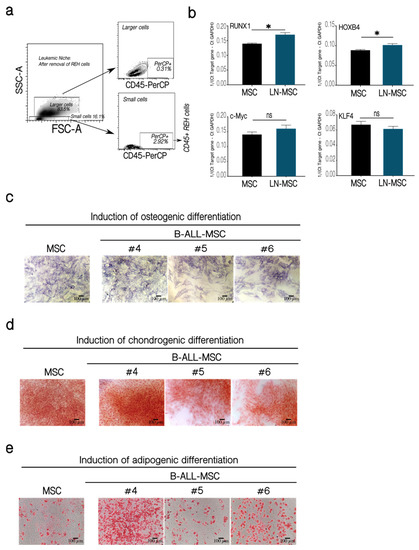 Self-renewal assessment in LN-MSC and multipotent differentiation capacity of BM-MSC from B-ALL patients. Expression of transcription factors associated with MSC self-renewal. (a) Less than 3% of REH cells were present in LN-MSC, as evaluated by flow cytometry. (b) mRNA expression of RUNX1, HOXB4, c-Myc, and KLF4 in a 3-days LN-MSC in passage 5. mRNA expression was calculated from the Ct of the target gene relative to GAPDH (1/(Ct Target gene—Ct GAPDH)). Two experiments with 10 replicates were analyzed. Data are expressed as mean ± SEM. p-value * < 0.05, ns (not significant) by Brown-Forsythe and Welch ANOVA test with Dunnett’s T3 post-hoc analysis. (c–e) MSC and B-ALL-MSC (#4–#6) were induced to differentiate to osteogenic and chondrogenic lineages for 21 days and to adipogenic lineage for 14 days. (c) Alkaline phosphatase staining for osteogenic differentiation. (d) Staining with Safranin O for chondrogenic differentiation. (e) Staining with Oil Red for identification of lipid vacuoles in adipogenic differentiation. Microphotographs at 10× (Scale bar, 100 µm) under phase-contrast microscopy of a representative experiment of MSC and B-ALL-MSC samples #4, #5, #6 is shown.