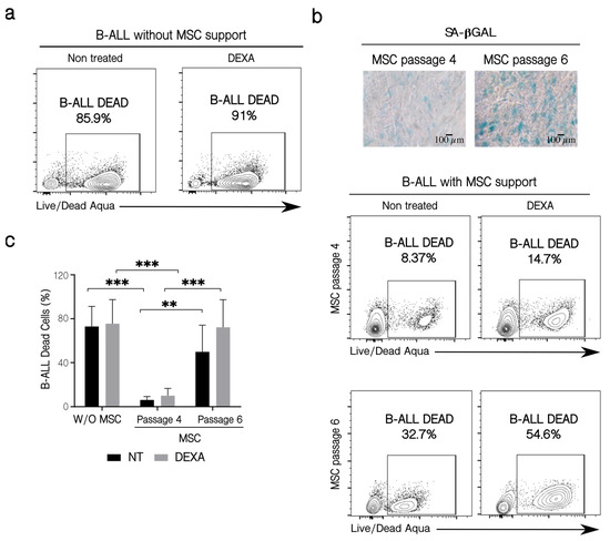 In particular, these observed alterations could be of clinical relevance since the senescent process occurring in MSC affected the susceptibility of leukemic cells to chemotherapeutic agents. We noticed a tendency to an increased susceptibility to DEXA of B-ALL cells when the proportion of senescent MSC in culture was augmented by the use of MSC in later passages, but this deserves further experimentation or the use of more B-ALL cell samples. In this regard, it will be interesting to evaluate the consequence of senescence in the early and late stages of treatment since the chemotherapy itself may also induce senescence [53].