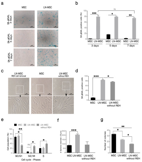 Long-term evaluation of the senescent process in MSC. (a) SA-βGAL activity was determined in LN-MSC at 3, 5, and 7 days. Microphotographs at 10× magnification of one replicate. Scale bar, 100 µm. (b) Percentage of SA-βGAL-positive cells. More than 20 cells per field, 10 fields per well or replicate. (c) LN-MSC morphology 3 days after washing out REH cells and culture with IMDM 10% FBS (LN-MSC without REH) of one experiment. Scale bar, 100 µm. Bottom, a zoomed-in view from the boxed region above. (d) SA-βGAL activity. More than 20 cells per field, 10 fields per well or replicate. One experiment with three replicates was analyzed. (e) Cell cycle-phases. (f) Number of spheres in LN-MSC (after removal of REH cells) cultured for 3 days with IMDM 10% FBS. (g) Number of colonies (CFU-F). In (b,d–g) two experiments with six replicates were analyzed. Data are expressed as mean ± SEM. p-value * < 0.05, ** < 0.01, *** < 0.001, ns (not significant) by the Kruskal–Wallis test (b,d,f) with Dunn’s post-hoc analysis and Brown-Forsythe and Welch ANOVA test (e,g) with Dunnett’s T3 post-hoc analysis.