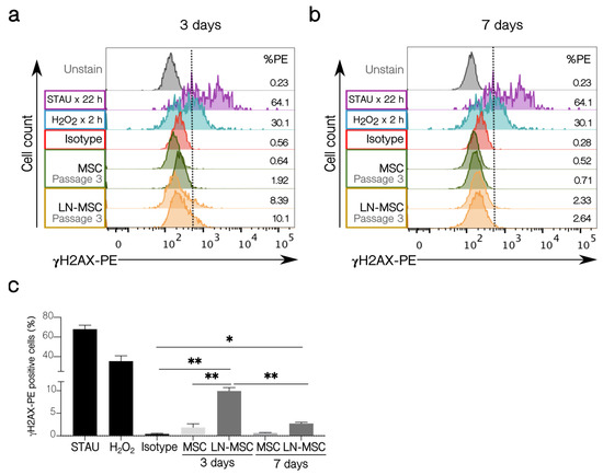 First, young fibroblasts treated with 5% H2O2 for 2 h, untreated senescent fibroblasts, and MSC in passage 3 treated with 1 µM or 2 µM STAU for 24 h were evaluated for γH2AX phosphorylation. Then, MSC and LN-MSC from the co-cultures (3 and 7 days) and positive controls of MSC treated with 2 µM STAU for 22 h and 5% H2O2 for 2 h were assessed by flow cytometry for the detection of γH2AX phosphorylation. For the determination of γH2AX (Ser139) phosphorylation, MSC were fixed with cold 1% formaldehyde and incubated at 4 °C for 15 min. Then, cells were centrifuged at 400× g for 5 min, and the supernatant was discarded. Cold 70% ethanol was added to the cell pellet and incubated at −20 °C for 1 h, followed by centrifugation at 400× g for 5 min. Cells were stained with monoclonal antibody anti-human H2A.X Phospho (Ser139) (Clone 2F3, BioLegend, San Diego, CA, USA) or mouse IgG1 isotype at a final concentration of 0.6 µg/mL in blocking buffer (1% BSA–0.2% Triton X-100 in 1× PBS) and incubated at 4 °C for 1 h in the dark. Finally, the cells were centrifuged at 400× g for 5 min, the supernatant discarded, and the cells resuspended in 1% BSA–1× PBS suspension buffer. Data were acquired on a FACS Aria III (BD Biosciences, Franklin Lakes, NJ, USA). Data analysis was performed with FlowJo software v10.7.1.