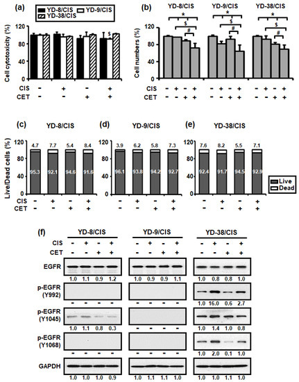 Combined treatment with cisplatin (CIS) (1 μg/mL) and cetuximab (CET) (200 μg/mL) do not induce cell cytotoxicity after 15 h but reduced cell growth after 72 h in cisplatin-resistant OSCC cells. (a) Cell cytotoxicity was detected using the LDH assay (mean ± SD; n = 6). * p < 0.05 versus non-treated group in YD-8/CIS cells, $ p < 0.05 versus non-treated group in YD-9/CIS cells, and # p < 0.05 versus non-treated group in YD-38/CIS cells. (b) The number of cells was measured using the trypan blue assay (mean ± SD; n = 6). * p < 0.05 versus non-treated group, $ p < 0.05 versus only cisplatin-treated group, and # p < 0.05 versus only cetuximab-treated group. (c–e) Live/dead cell ratio was calculated based on the result of (b). (f) The effects of cetuximab were confirmed using the expression levels of EGFR signaling pathway proteins in cell lysates from all three cell lines treated with cisplatin and/or cetuximab for 72 h. The levels of the indicated proteins (epidermal growth factor receptor (EGFR), phosphor-EGFR (p-EGFR) (Y992, Y1045, Y1068), and glyceraldehyde-3-phosphate dehydrogenase (GAPDH)) were determined using the Western blot assay. Western blot results were quantified as values calculated using the Image J software. The numbers represent the ratio of the optical density of cisplatin and/or cetuximab-treated to non-treated cells normalized by GAPDH.