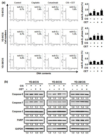 Cisplatin (CIS) (1 μg/mL) and cetuximab (CET) (200 μg/mL) combination for 72 h did not affect apoptosis in cisplatin-resistant OSCC cells. (a) Left panel, the cytotoxic effect of cisplatin and/or cetuximab in cisplatin-resistant OSCC cells was measured using PI staining assay. A sub-G1 peak may be present when cells enter apoptosis in the G1 phase. Right panel, graph shows quantitative results for left panel (mean ± SD; n = 3). * p < 0.05 versus non-treated group in YD-8/CIS cells, # p < 0.05 versus non-treated group in YD-9/CIS cells, and $ p < 0.05 versus non-treated group in YD-38/CIS cells. (b) Levels of apoptosis signaling pathway proteins (Caspase-9, -7, -3, and poly (ADP-ribose) polymerase (PARP)) and glyceraldehyde-3-phosphate dehydrogenase (GAPDH) in cell lysates from all three cell lines treated with cisplatin and/or cetuximab for 72 h were determined using Western blot assay. Western blot results were quantified using Image J software. The numbers represent the ratio of the optical density of cisplatin and/or cetuximab-treated to non-treated cells normalized by GAPDH.
