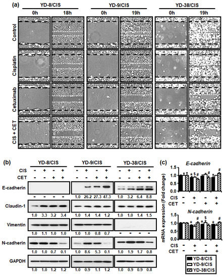 Cisplatin (CIS) (1 μg/mL) and cetuximab (CET) (200 μg/mL) co-treatment promoted greater reduction in cell motility and N-cadherin expression in cisplatin-resistant OSCC cells compared to each alone. However, co-treatment promoted the expression of E-cadherin, which is known to be involved in cell adhesion. (a) Cell migration was analyzed using in vitro scratch assay, whereas images were obtained using an Olympus CKX53 inverted microscope (×40). (b) The levels of EMT signaling pathway proteins (E-cadherin, claudin-1, vimentin, and N-cadherin) and GAPDH in cell lysates from all three cell lines treated with cisplatin and/or cetuximab for 48 h were determined using the Western blot assay. Western blot results were quantified using Image J software. The numbers represent the ratio of the optical density of cisplatin and/or cetuximab-treated to non-treated cells normalized by GAPDH. (c) The expressions of E-cadherin and N-cadherin mRNA from all three cell lines treated with cisplatin and/or cetuximab for 24 h were determined using real-time qRT-PCR (mean ± SD; n = 3). * p < 0.05 versus non-treated group in YD-8/CIS cells, # p < 0.05 versus non-treated group in YD-9/CIS cells, and $ p < 0.05 versus non-treated group in YD-38/CIS cells.