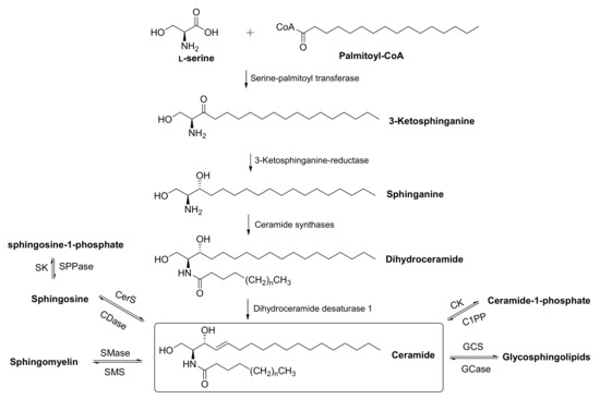 - Michel, C.; van Echten-Deckert, G.; Rother, J.; Sandhoff, K.; Wang, E.; Merrill, A.H., Jr. Characterization of Ceramide Synthesis. J. Biol. Chem. 1997, 272, 22432–22437. [Google Scholar] [CrossRef] [PubMed] [Green Version]