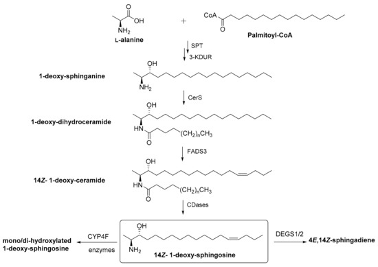 We have recently elucidated the chemical structure of 1-deoxysphingosine, the major LCB derived from an alanine instead of serine incorporation into the SPT reaction. We revealed that the primary misguided metabolic step is followed by an unexpected non-canonical introduction of the double bond. Instead of the 4E, a 14Z double bond was introduced [18]. It has been found that this double bond is formed by the desaturase FADS3, which is also responsible for introduction of the 14Z double bond in sphingadienine [19,20]. Furthermore, the alternative catabolism of this atypical LCB by members of the cytochrome P450 family and the resulting metabolites has been elucidated (Figure 2) [21]. Notably, the metabolic intermediates that have characterized during these studies have the potential to serve as potential biomarkers, not only for diseases such as HSAN1, but may also be highly predictive for the occurrence of neuropathy in diabetic patients [22]. Recently, the restricted metabolism of deoxysphingolipids was successfully employed for fluorescent “dead end” metabolic probes [23,24].