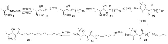 Next, both the hydroxyl group and amino group were protected by reaction with dimethoxy propane to provide intermediate 22. The latter was then reacted with lithiated 1-pentyne in the presence of HMPA (as a cosolvent) to furnish compound 23 in moderate yield. Stereoselective reduction to the desired Z-configuration was successfully achieved by hydrogenation of compound 23 in the presence of Lindlar catalyst to produce the protected d-14Z-deoxy-sphingosine 24 (no E-stereoisomer was observed). Finally, deprotection of all protecting groups under acidic conditions furnished the desired d-14Z-deoxy-sphingosine 25. This compound has been used in several metabolic approaches to investigate the 1-deoxysphingolipid metabolism to unexplored the physiological roles of 1-deoxysphingolipids (unpublished data). Further, 1-deoxy-sphingosine has been highlighted as a potential biomarker for several human diseases including diabetic retinopathy, however, their detection and quantification are mainly based on the calibration curves of the native analyte since there are no standards available for the deuterated 1-deoxysphingolipids, Therefore, compound 25 would be a useful analytical tool as a mass standard for quantification of cellular 1-deoxy-sphingolipid levels [21].