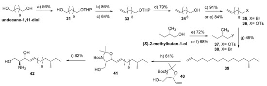 We recently identified 16S-methyl-sphingosine as the main product of the subunit SPTLC3 reaction through the condensation of anteiso-methyl-palmitate with L-serine [64]. To proof this finding and to in-deep investigate its metabolism, we envisioned the synthesis of the methyl-branched LCB 42. As shown in Scheme 6, the synthesis of 42 was depicted via cross-coupling metathesis of the 13S-pentadecene 39 and the protected aminodiol derivative 40. The latter was obtained in 7-steps from L-serine with a overall yield of 21% [33]. The key challenge in the synthesis of 42 was to obtain a stereisomer pure alkene 39. To this end, we decided to start the synthesis from a chiral auxiliary (S)-2-methylbutanol. Initially, we have followed the previously reported route [65]. Thus, (S)-2-methylbutanol was treated with tosyl chloride in pyridine to afford the corresponding tosylated derivative 37 in a good yield. On the other hand, the 11-bromo-undecene 35 was synthesized in 5-steps starting from 1,11-undecandiol [34]. Briefly, the long-chain terminal diol was selectively mono-protected with a THP group as described above. The resulting alcohol 31 was brominated via Appel reaction followed by Br-elimination to yield the terminal alkene 33. After acidic deprotection of the THP group, the obtained hydroxyl alkene 34 was subjected to Appel reaction to afford 11-bromo-undecene 35 in a quantitative yield. Subsequently, the 11-bromo-undecene 35 was converted to the corresponding Grignard form via reaction with magnesium metal. Unfortunately, coupling of tosylated alcohol 37 to the freshly prepared 11-undecenylmagnesium bromide in the presence of catalytic Li2Cu2Cl4 following the reported conditions [65,66] provided the desired 13S-methyl-petadecene 39 in a very low yield (less than 20%). Several trials have been performed in order to improve the yield of the desired product (reactant equivalents, catalyst amount, reaction time, etc.), however did not provide any significant effect. Furthermore, the NMR-spectra of the obtained product revealed that compound 39 is contaminated with 11-undecene, which could be formed via hydrolysis of the Grignard form of compound 35.
