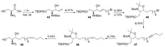 We initially attempted to follow our reported synthetic route for the synthesis of the 1-deoxy-analogue of the targeted molecule, starting from O-TBDPS-N-Boc L-serine (Scheme S1) [18]. Unfortunately, when the respective Weinreb amide of protected serine was treated with 11Z-pentadecenylmagnesium bromide under reported conditions, the desired protected 3-keto-14Z-sphingosine was only obtained in very low yield (>10%). Attempts to improve the yield (temperature, additives, Grignard equivalents, changing O-protecting group), did not afford any enhancement. Accordingly, we thought to start from the well-known intermediate 43, since both stereocenters are already established, and to make use of the cross-coupling metathesis to construct the lipophilic tail (Scheme 7). Toward this end, intermediate 43, obtained from L-serine in 5-steps [33], was subjected to cross-metathesis reaction with 10-bromo-decene under modified conditions to afford the truncated bromo-sphingosine 44 in a moderate yield and without any isomerization detected (E/Z 9:1, 51%). Hydrogenation of the double bond in E/Z 44 and subsequent acetal protection provided the corresponding fully protected bromo-sphinganine 46. The latter was treated with lithiated pentyne in the presence of HMAP to provide intermediate 47 in a 63% yield. Stereoselective reduction to the Z-isomer was achieved by subjecting compound 47 to a hydrogenation reaction in the presence of Lindlar catalyst to afford the protected 14Z-sphingosine 48 as a main product (E/Z 20:1, 74%). Deprotection of 48 was proceeded in two subsequent steps, treatment with TBAF followed by acidic deprotection, to furnish the target molecule 14Z-sphingosine 49 in a 43% yield (over 2-steps).
