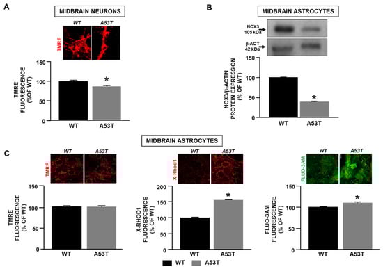 Mitochondrial function and NCX3 expression in mesencephalic neuronal cells from A53T-α-syn and WT mouse embryos/pups. (A) Quantification of the changes in mitochondrial membrane potential measured in primary mesencephalic neurons from A53T-α-syn and WT mouse embryos by confocal microscopy. (B) Quantification of NCX3 expression in primary mesencephalic astrocytes from A53T-α-syn and WT mouse pups (P1). (C) Quantification of mitochondrial membrane potential, [Ca2+]m and [Ca2+]c in primary astrocytes from A53T-α-syn and WT mouse pups by confocal microscopy (P1). In A and C: each bar represents the mean ± S.E.M. of the percentage of fluorescence intensity values of at least 20–30 neurons recorded in three independent experimental sessions. In B: each bar represents the mean ± S.E.M of the percentage of the NCX3 protein expression obtained in three independent experimental sessions. * p < 0.05 vs. WT neurons/astrocytes.