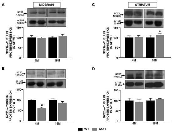 NCX1 and NCX3 expression in midbrain and striatum obtained from 4 and 16-month-old A53T-α-syn and WT mice. Western blot analysis of NCX1 and NCX3 protein expression in midbrain (A,B) and striatum (C,D) from A53T-α-syn and WT mice. Each bar represents the mean ± S.E.M. of the percentage of different experimental values obtained in three independent experimental sessions. * p < 0.05 compared to WT mice at the same age.