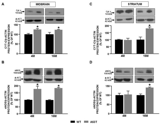 Cyt c and nNOS expression in midbrain and striatum obtained from 4 and 16-month-old A53T-α-syn and WT mice. Western blot analysis of Cyt c and nNOS protein expression in midbrain (A,B) and striatum (C,D) from A53T-α-syn and WT mice. Each bar represents the mean ± S.E.M. of the percentage of different experimental values obtained in three independent experimental sessions. * p < 0.05 compared to WT mice at the same age.
