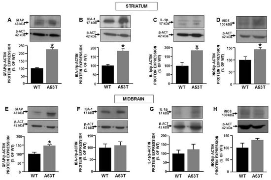 Activation of neuronflammation in 16-month-old A53T-α-syn mice. Western blot analysis of GFAP, IBA-1, iNOS, and IL-1β protein expression in striatum (A–D) and midbrain (E–H) from A53T-α-syn and WT mice. Each bar represents the mean ± S.E.M. of the percentage of different experimental values obtained in three independent experimental sessions. * p < 0.05 compared to WT mice.