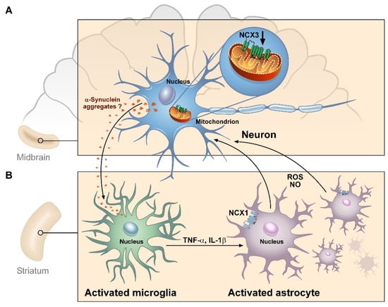 Schematic model illustrating the cellular and molecular events leading to neuroinflammation in A53T-α-syn mice. (A) The NCX3 impaired expression in the midbrain leads to mitochondrial dysfunction in dopaminergic neurons with consequent cellular damage and release of toxic factors (probably aggregated α-syn) able to induce microglial cells’ activation in the striatum. (B) The microglial activation in the striatum may induce pro-inflammatory cytokines’ release that in turn stimulates NCX1-driven astrocyte proliferation. Finally, the activated astrocytes in the striatum may invade the midbrain, further contributing to dopaminergic neuronal damage.