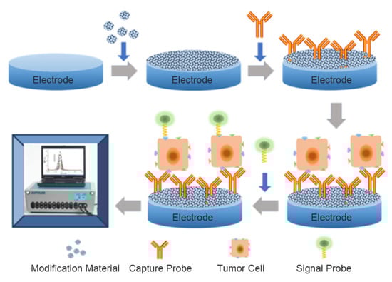 As a subclass of electrochemical biosensors, electrochemical cytosensors consist of a biometric element, an electrochemical sensor, and cells. Some also contain probes to amplify signals. Through electrochemical technology, the interactions between biometric elements (antibodies, aptamers, lectins, etc.) and target cells are converted into electrical signals, which are converted into usable information through a transducer and signal processor [10]. Electrochemical cell sensors used for detection of markers on tumor cells usually use the sandwich model, as exhibited in Figure 2. In addition, some special electrochemical cell sensors are used to detect cancer cells [11]. We reviewed some of the electrochemical cell sensors used to detect the markers on tumor cells over the last five years.