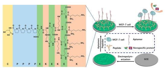 Transmembrane glycoprotein mucin 1 (MUC1), nucleoli [13], and epidermal growth factor receptor (EGFR) are frequently used markers in the electrochemical detection of breast cancer cells, which have been proven to be highly overexpressed on the surfaces of breast cancer cells [14]. Ou et al. constructed a sandwich-cell-based sensor using two aptamers (AS1411 and MUC1) linked with a metal–organic framework (PCN-224) and tetrahedral DNA nanostructures (TDNs) to detect breast cancer cells [15]. TDNs linked with dual aptamers immobilized on the gold electrode (GE) increased the density and orientation of the surface nanoprobe. A probe modified with PCN-224 as the skeleton was used to amplify the electrochemical signal. The sensor exhibited a wide linear range (20–1 × 107 cells/mL) and a low detection limit (6 cells/mL), as detected by differential impulse voltammetry (DPV). Song and his team synthesized a novel nanocomposite, which was used for construction of an electrochemical-cell-based biosensor and detection of EGFR overexpressed in MCF-7 cells [16]. A new bimetallic CuCo Prussian blue analogue (CuCo PBA) loaded with carbon dots (CDs) (CD@CuCoPBA) presented a nanocube shape and retained its nanostructure and physicochemical properties, showing excellent electrochemical activity and high stability. With the biocompatible nanocomposite composed of multiwalled carbon nanotubes and polyglutamate, Yazdanparast et al. developed an aptamer-based sandwich method for sensitive and selective detection of human breast cancer cells and MUC1 biomarkers [17]. MCF-7 cells were captured by aptamers fixed on the electrode, then the aptamers labeled with silver nanoparticles were used for secondary cell recognition to increase the selectivity and amplify the signal. Under optimal conditions, the cell-based biosensor responded to MCF-7 cells within a concentration range of 1.0 × 102–1.0 × 107 cells/mL, with a detection limit of 25 cells/mL. Yang et al. prepared a multiaptamer DNA tetrahedron nanostructure and applied it and the MUC1 aptamer to the cell-based biosensor. After a series of optimization processes, they finally obtained a high-quality sensor for MCF-7 cells, with a detection range of 50–1.0 × 106 cells/mL and a detection limit of 5 cells/mL [18]. In order to prevent nonspecific binding and improve specificity, Liu et al. developed an antifouling electrochemical-cell-based biosensor to detect MCF-7 cells in a complex biological environment [19]. In this work, polyaniline membrane was electrodeposited on an electrode to support the MUC1 aptamer and an investigator-designed antifouling branched peptide (Figure 3). The reported cell-based biosensor had an excellent linear range (50–1.0 × 106 cells/mL) and detection limits (20 cells/mL) for MCF-7 cells.