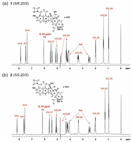 The compound 5(R)-hydroxymethyl-7-ethyl-9-(N-azetidinyl)methyl-10-hydroxy- camptothecin and its diastereomer 5(S) were obtained as formate salts using one-pot synthesis (see also the Supplementary Materials—SM) []. Their RT values as determined by HPLC were 5.7 and 11.0 min for 5(R) and 5(S), respectively (see the HPLC of the reaction mixture in Figure S1, in the SM). Then, the compounds were separated and purified by HPLC and converted into hydrochlorides 1 ((5R, 20S)) and 2 ((5S, 20S)).