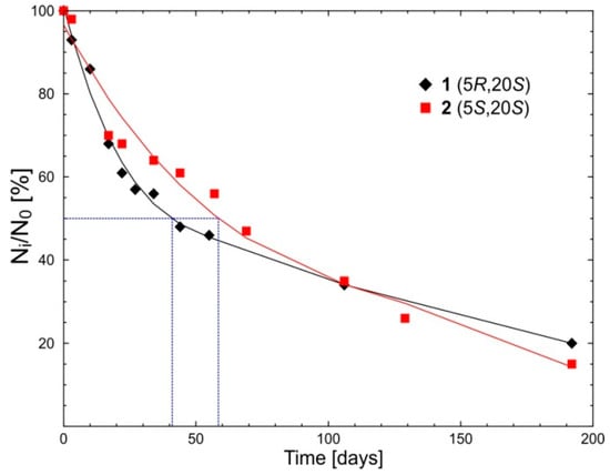 The property of chemical and stereochemical stability in water is crucial for a potential medicine that needs to reach its biological target in an unchanged form. The results of kinetic experiments, which reflect the stability of both diastereomers at pH 5 in water solution, are shown in Figure 3. This allowed estimation of the half-life time t½, which is similar for both diastereomers.