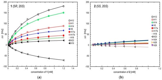 The self-association of both diastereomers was confirmed in diffusion experiments, performed on samples with selected concentrations (Table 2). It was observed that in both cases, the value of the Di coefficient increased at a lower concentration, reflecting the dissociation process of self-aggregated species.