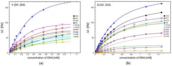 The chemical shift changes of the proton signals of 1 (a) and 2 (b), Δδ [Hz], during titration by octamer 3 (DNA), as a function of the concentration of 3 [mM]; D2O buffer, (25 mM NaCl/25 mM K3PO4), pH 6.0, temp. 10 °C.