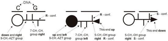 Schematic representation of the conformational geometries of diastereomers 1 and 2 vs. the ultimate base pair G1-C8.