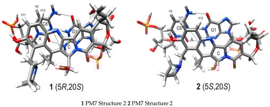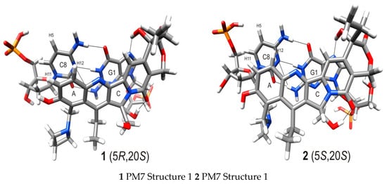 Molecular model of MD of the less abundant structures of the complexes of the ultimate base pair G1-C8 of a self-complementary duplex d(GCGATCGC)2 with diastereomers 1 (see Table 6, No. 2) and 2 (see Table 7, No. 2). Base-paired hydrogen bonds are shown. Both substituents on C5 and C20 point outward from the molecular complex in 1, but the C5 substituents in 2 point towards the molecular complex space.