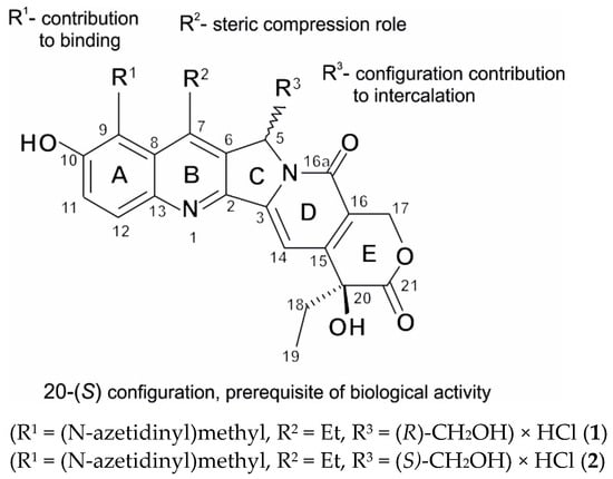 In biological studies, the DNA/topoisomerase I (Topo I) complex has been firmly established as a molecular target of anticancer drugs [,,,]. Potential Topo I inhibitors of the camptothecin family, currently in the clinical stage of development [,], are mainly the outcome of SAR studies []. The role of topoisomerase I inhibitors involves ternary complexes composed of enzyme/DNA/inhibitor []. Because studied compounds are considered for driving into further preclinical studies due to their favorable response to non-neoplastic cells, it was essential to compare their properties in a binary complex DNA/inhibitor with respect to their role as Topo I poisons in a ternary complex DNA/Topo I/inhibitor, by hindering the relegation of unstrained duplex of cancer DNA. The inhibitor interacts with both components of a ternary complex, the DNA, and an enzyme; therefore, the substituents around the camptothecin core (Scheme 1) contribute essentially to the final impact of an inhibitor on its biological activity. The cleavage site in DNA, formed via enzymatic action, is a molecular target for the inhibitor, and a substitution pattern in the camptothecin core is of primary importance. Earlier results have shown that depending on the nature and site of substitution in a camptothecin core, the substituent can play different roles in biomolecular interactions with nicked DNA. Certain SN38 derivatives with alkylamino substituents at position C9 can cause alkylation of DNA via formation of an o-methylene quinone intermediate with a neighboring hydroxy group [,,]. The lack of an ethyl group at C7, as in topotecan, results in intercalation of 9-alkylamino-substituted camptothecins with natural [] or nicked DNA oligomers []. The substituents on C5 can, in general, contribute to strengthening the intercalation.