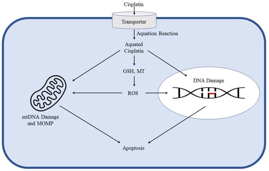 Despite decades of research and early identification of DNA as the primary cellular target of cisplatin, the mechanisms involved in cisplatin sensitivity and toxicity remain to be fully elucidated. Cisplatin’s antitumor activity begins with cellular uptake through copper [], anion [,,], and cation transporters [,,,]. It is subsequently aquated, allowing it to bind to the guanine N7 position on DNA []. By doing so, cisplatin generates DNA adducts in a highly conserved manner. The most common of these adducts are 1,2-intrastrand d (GpG) (between adjacent guanine bases on the same DNA strand) and 1,2-intrastrand d (ApG) (between adjacent adenine and guanine bases on the same DNA strand) crosslinks. These adducts distort the helical structure of the DNA molecule, disrupting replication and transcription [,,]. Disruption of nuclear DNA is the most studied mechanism of cisplatin cytotoxicity; however, mitochondrial DNA damage is also indicated. In fact, studies show that cisplatin binds to both nuclear and mitochondrial DNA with the same affinity. Disruption of mitochondrial DNA replication and transcription leads to mitochondrial degradation and apoptosis [,]. In addition to DNA damage, cisplatin binds to cytoplasmic molecules, such as glutathione (GSH) and metallothionein (MT). Binding of these substrates results in the generation of reactive oxygen species (ROS) that disrupt mitochondrial membranes, damage DNA, and eventually induce apoptosis [] (Figure 1).