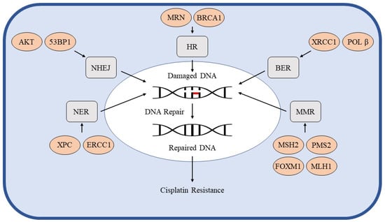 The primary DNA repair pathways include homologous recombination (HR), nucleotide excision repair (NER), NHEJ, base excision repair (BER), and mismatch repair (MMR). When cells are defective in one of these pathways, DNA damage accumulates. If the damage is tolerable, the cells will continue to divide, passing erroneous genome to progeny cells. The generation and propagation of an unstable genome is one significant factor contributing to the development of cancer []. However, cells that are deficient in one DNA repair pathway are significantly more sensitive to treatment with DNA-damaging agents, including cisplatin. Redundancy does exist among the DNA repair pathways, where tumor cells deficient in one pathway will compensate using other functional pathways. However, cells with a DNA repair pathway defect are generally more sensitive to agents that rely primarily on that pathway []. Not surprisingly, numerous proteins involved in the repair pathways have also been implicated in cisplatin resistance. Therefore, a comprehensive understanding of these pathways and their respective proteins is necessary to develop more effective strategies to overcome the challenges of cisplatin resistance and toxicity.