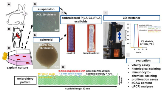 Scheme of the experimental setting. New Zealand rabbits (A) are the tissue and cell donors for this study. The anterior cruciate ligament ((B), marked in red) was dissected from the knee joint and cultured via explant culture (C). Two cultivation strategies, the suspension (D) and the spheroid culture (E) were performed for scaffold colonization. Non-functionalized (control) and functionalized embroidered poly(l-lactide-co-ε-caprolactone (P(LA-CL)) scaffolds (30 mm × 4 mm × 1 mm) were compared (F). The scaffold embroidery (G) consisted of a zigzag pattern with 1.8 mm stitch length, 15° stitch angle and 0.2 mm duplication shift. After pre-cultivating the scaffolds with cells, scaffolds were put into a 3D stretcher and 4% stretched (0.11 Hz) for 72 h (H). The cycle starts with a pause time (=dwell time-2 of 4.2 s, yellow line). In this phase the scaffolds were in a “zero position”. Then, the scaffolds were stretched with a speed of 2.4 mm/s (blue line) to reach the defined stretch position of 4% (0.6 mm amplitude). The stretched scaffold remained in this position for 4.2 s (=dwell time-1, green line). Then, the scaffolds were transferred to the starting position with a speed of 2.4 mm/s (red line) and left in this position for 4.2 s (=dwell time-2, yellow line). This stretch cycle was continuously repeated for 72 h (H). Evaluation (I) included vitality assay, histological staining, immunocytochemical staining, DNA and sulphated glycosaminoglycan (sGAG) content measurements and real time polymerase chain reactions (qPCR).