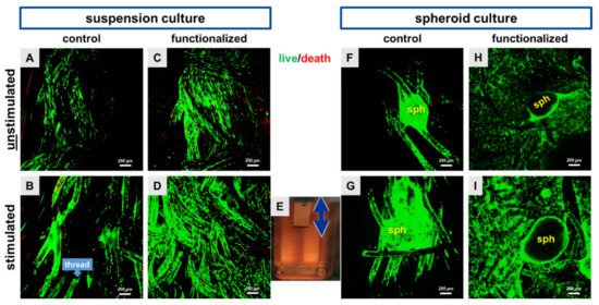Representative scaffold pictures after the vitality assay, where live cells were depicted in green and dead cells were depicted in red. Both pre-cultivation strategies, the dynamical cell suspension (24 h) and the statical spheroid colonization (5 days) were performed on control scaffolds (A,B,F,G) and on functionalized scaffolds (C,D,H,I). Unstimulated (A,C,F,H) scaffolds were compared with stimulated (72 h, 4% stretch, 0.11 Hz, (B,D,G,I)) ones. A scaffold inside the stretch device (E) is shown, the double-headed arrow marks the stretch direction. Scale bars: 200 µm. Three independent experiments with cells of three different donors were performed.